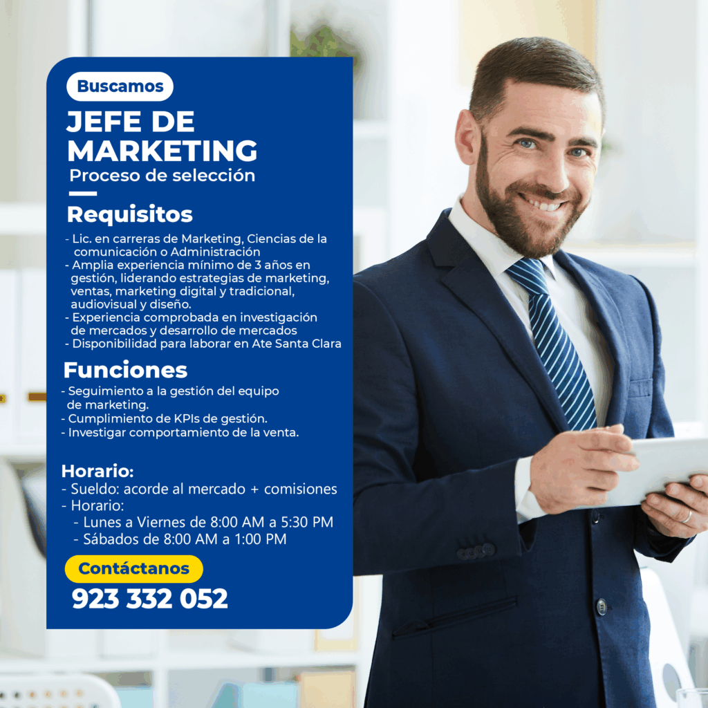 - Amplia experiencia mínimo de 5 años en gestión, liderando estrategias de marketing, ventas, marketing digital y tradicional, audiovisual y diseño.