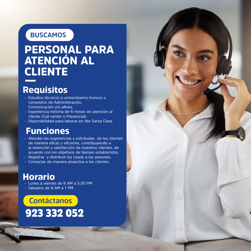 - Experiencia minima de 6 meses en atención al cliente (Call center o Presencial).
